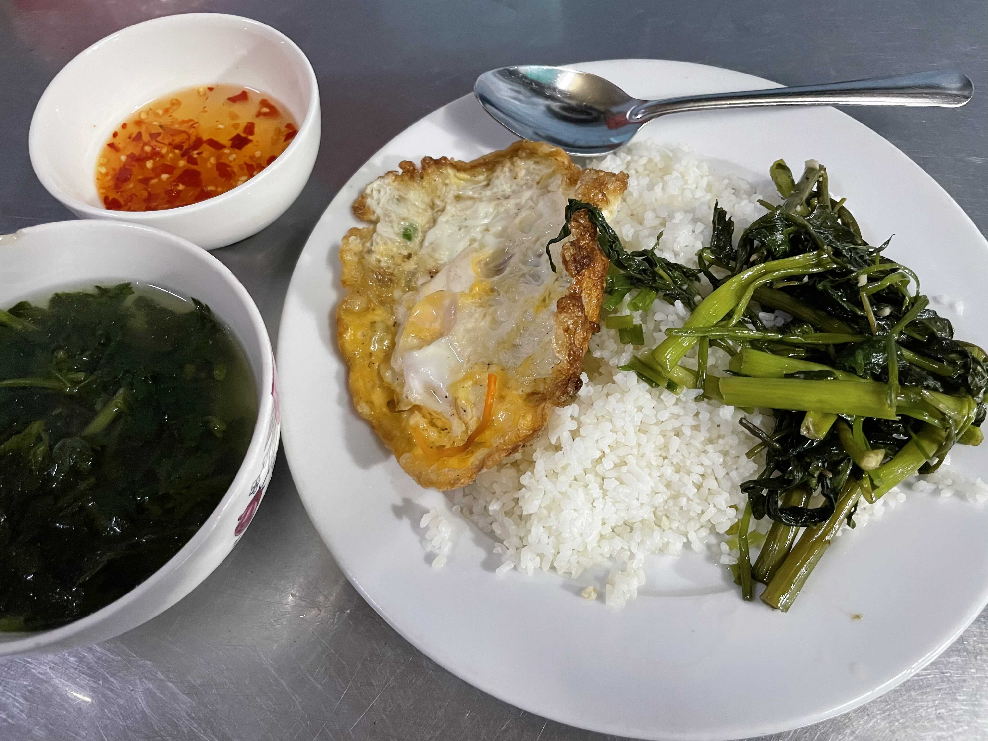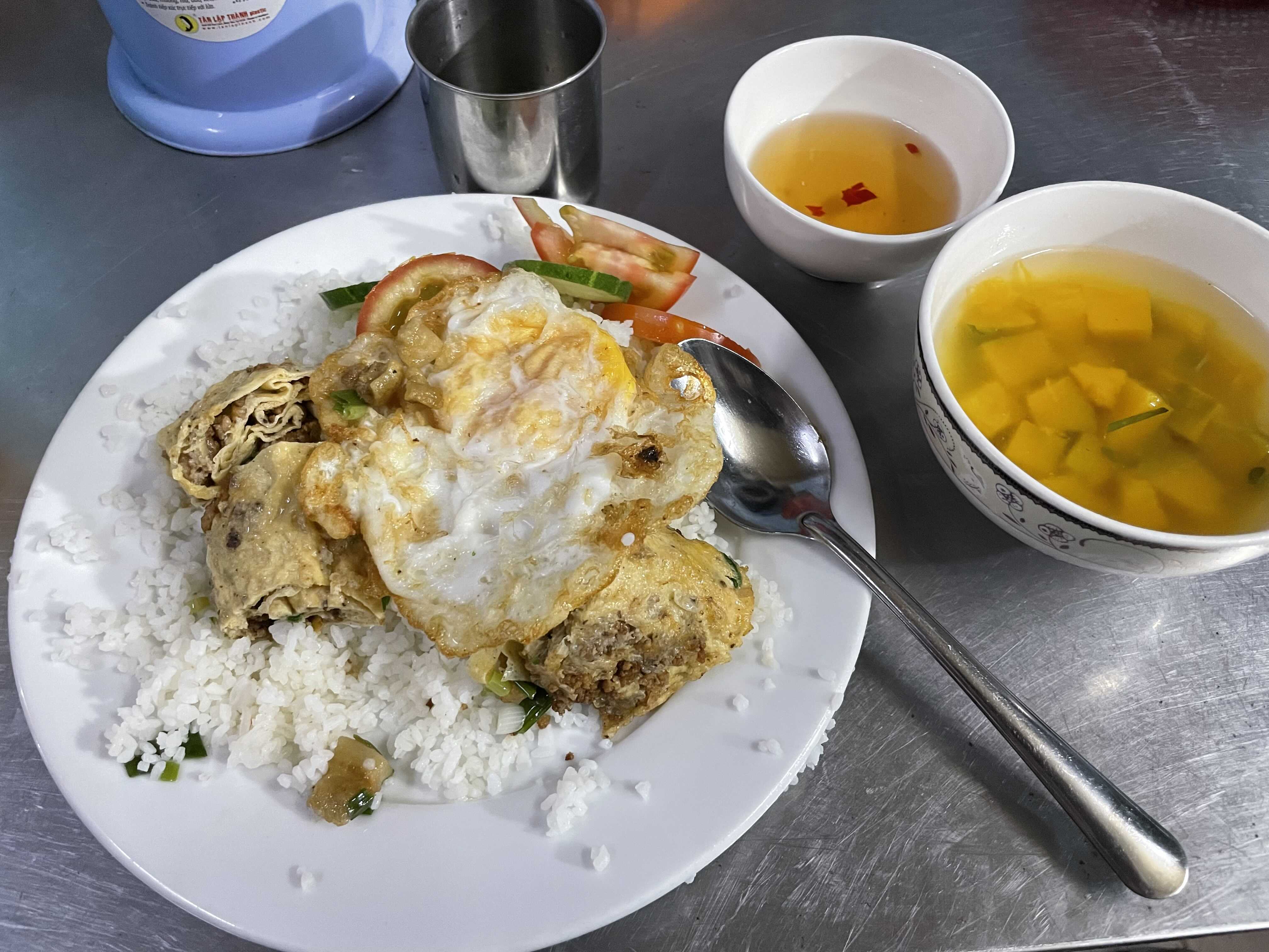 요거도 집 옆에 밥집. 내가 베트남어를 잘 할줄 모르니 계란말이 비슷한거도 얹어주셨는데, 나에게는 이것마저 헤비하여... 다음번에는 빼달라 했다ㅎ
