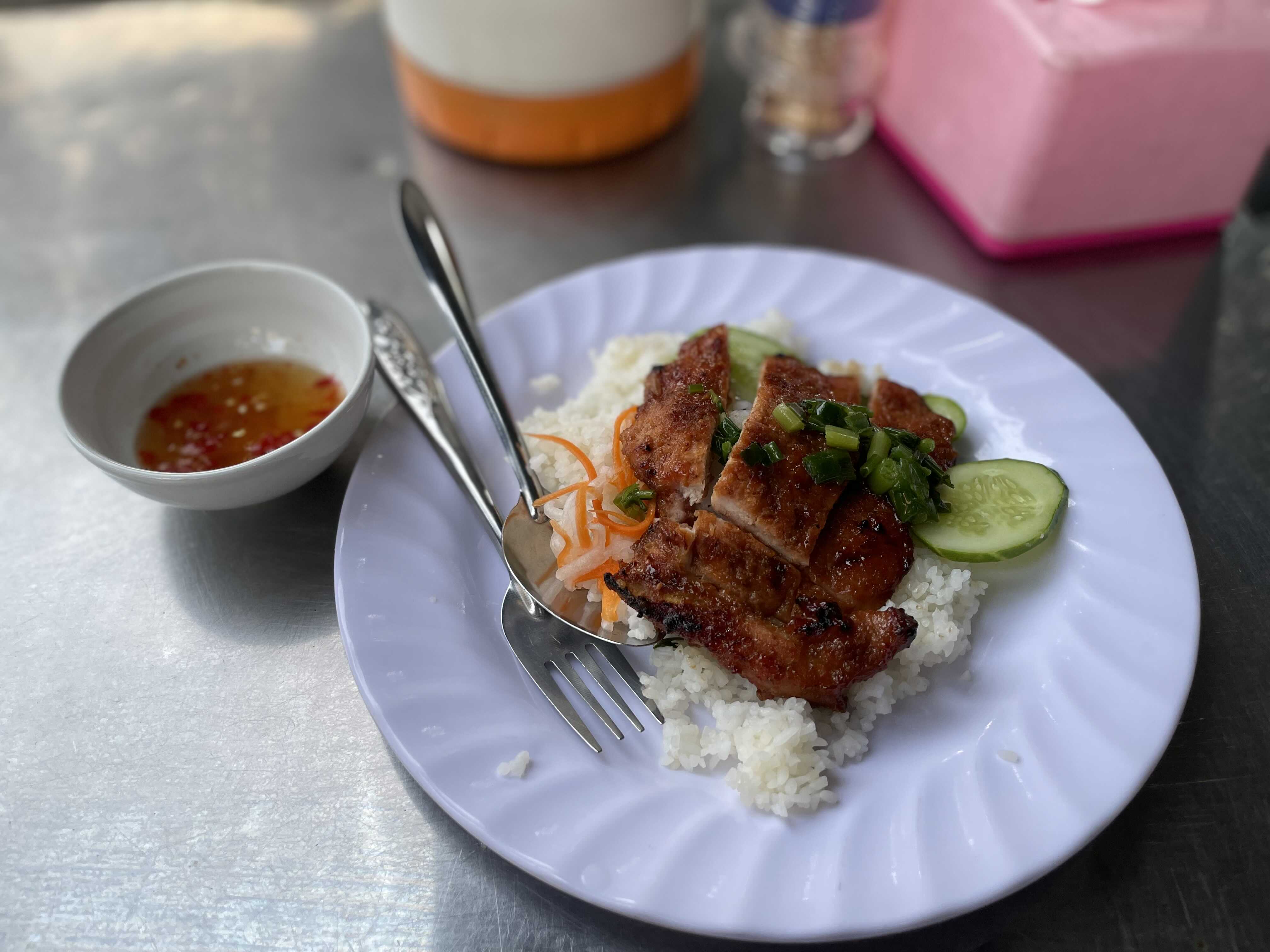 껌땀은 부드러운 돼지고기를 얹은 것, 껌승은 약간 뼈대가 붙어있던데... 대충 그렇게 인지하고 있는데, 사실 같은 것일 수도 있다. 차차 그 차이를 물어봐야겠다. 보통 30,000동~35,000동 정도(더하는 재료에 따라)