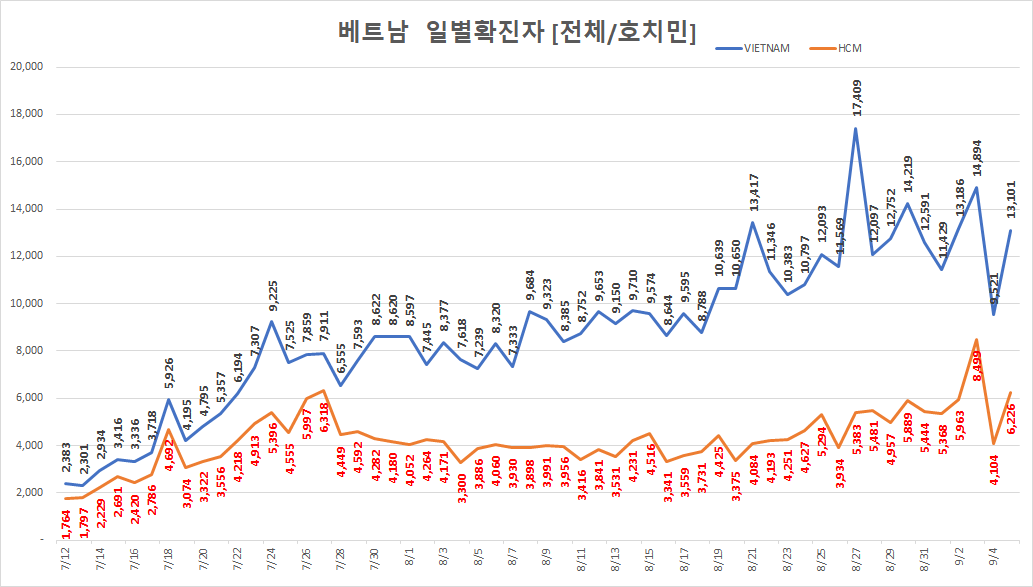 베트남 전체 일일 확진자 수는 13,137명