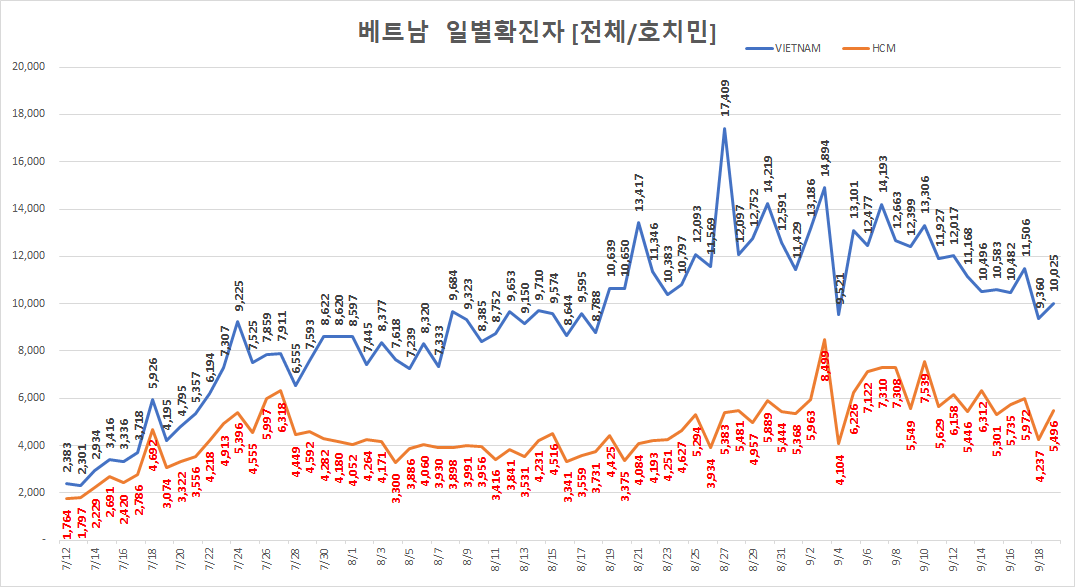 오늘자 호치민 일일 확진자는 다시 5,496명 ( 9/19 )