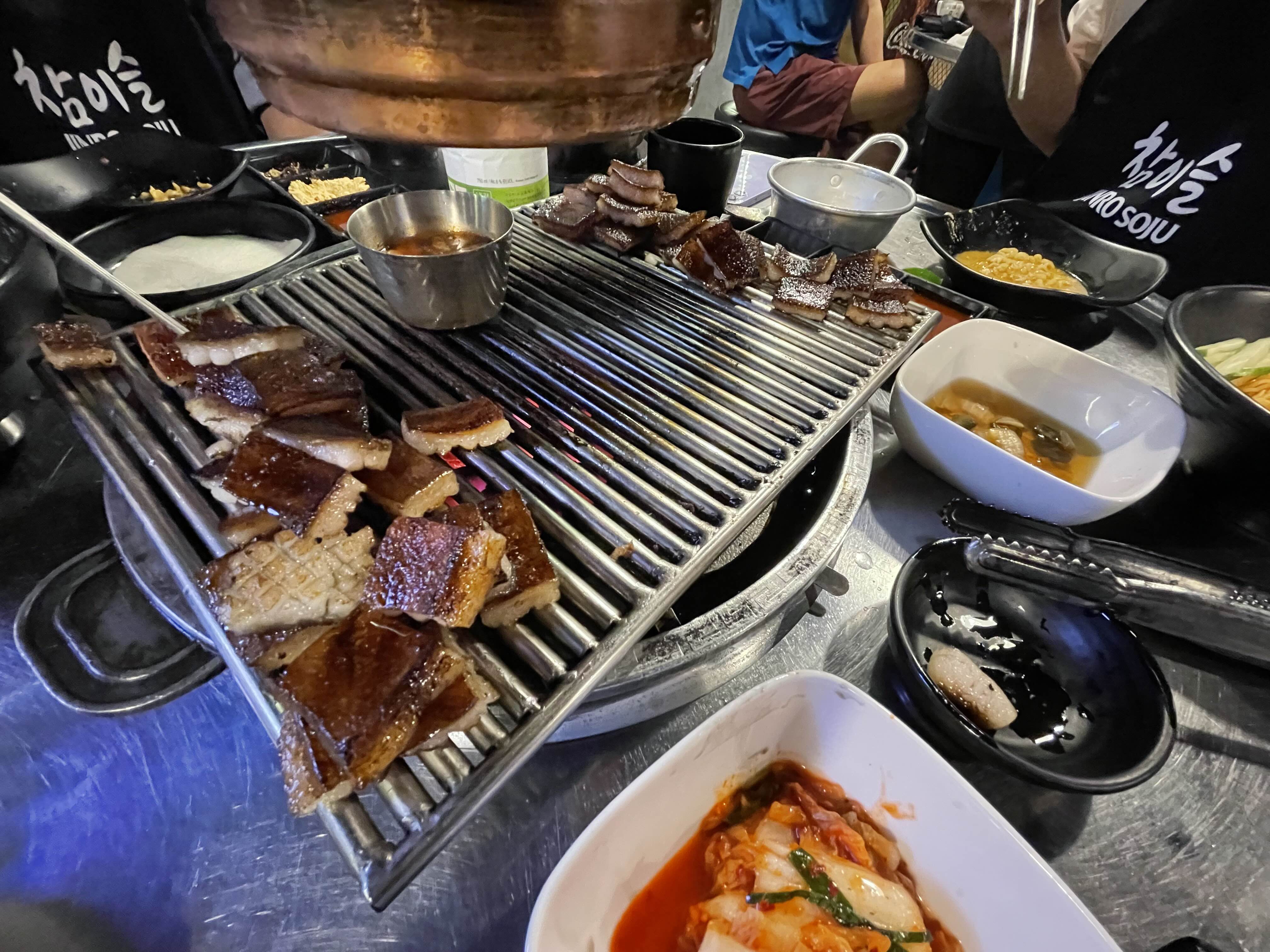 밤에는 돼지 껍데기를 구워먹었다.
