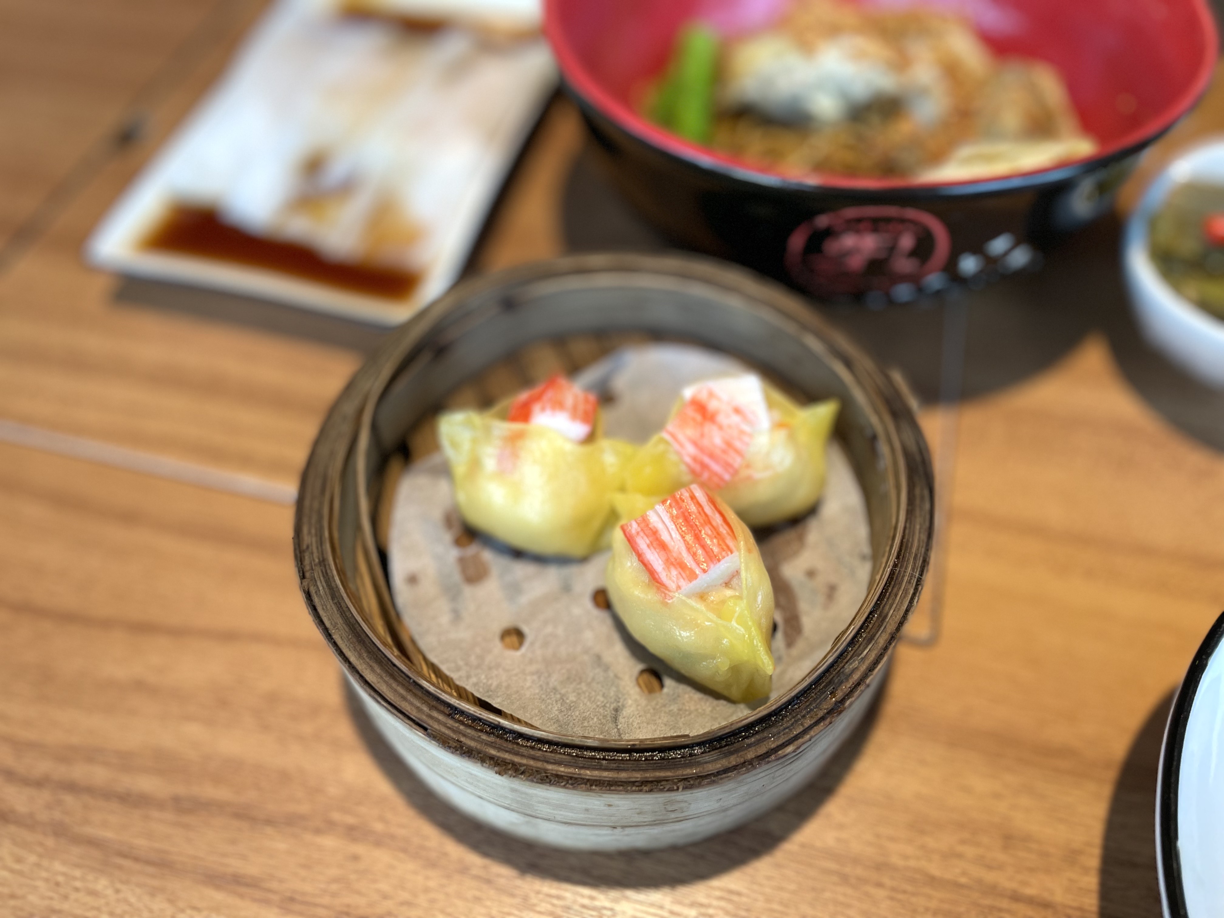 살라미 딤섬이라길래... 새우 속과 게살이 좀 섞인 것인 줄 알았는데, 게맛살이 올려져 있다.