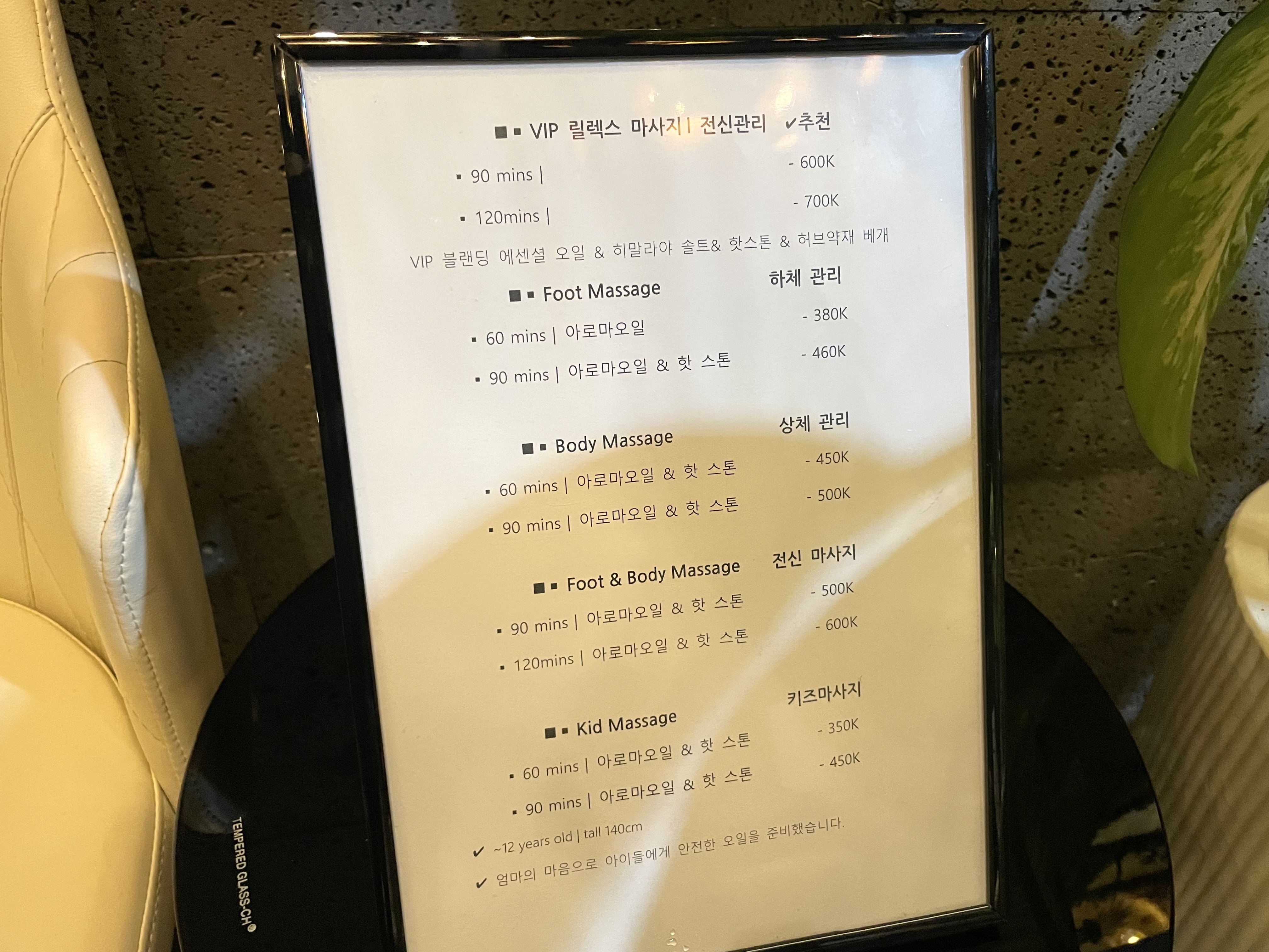 우리는 90분 foot & body massage를 선택! 50만 동.