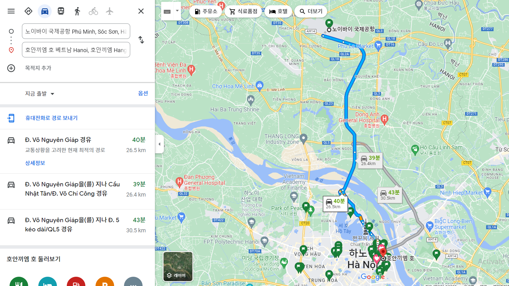 호치민 공항은 호치민시 중심에 위치해있어서 이동 거리를 생각할 필요가 없었는데, 하노이 공항은 시내까지 40분은 잡아야 한다. ( 낮 시간대라면 교통 체증으로 인하여 1시간 정도 걸릴 듯 )