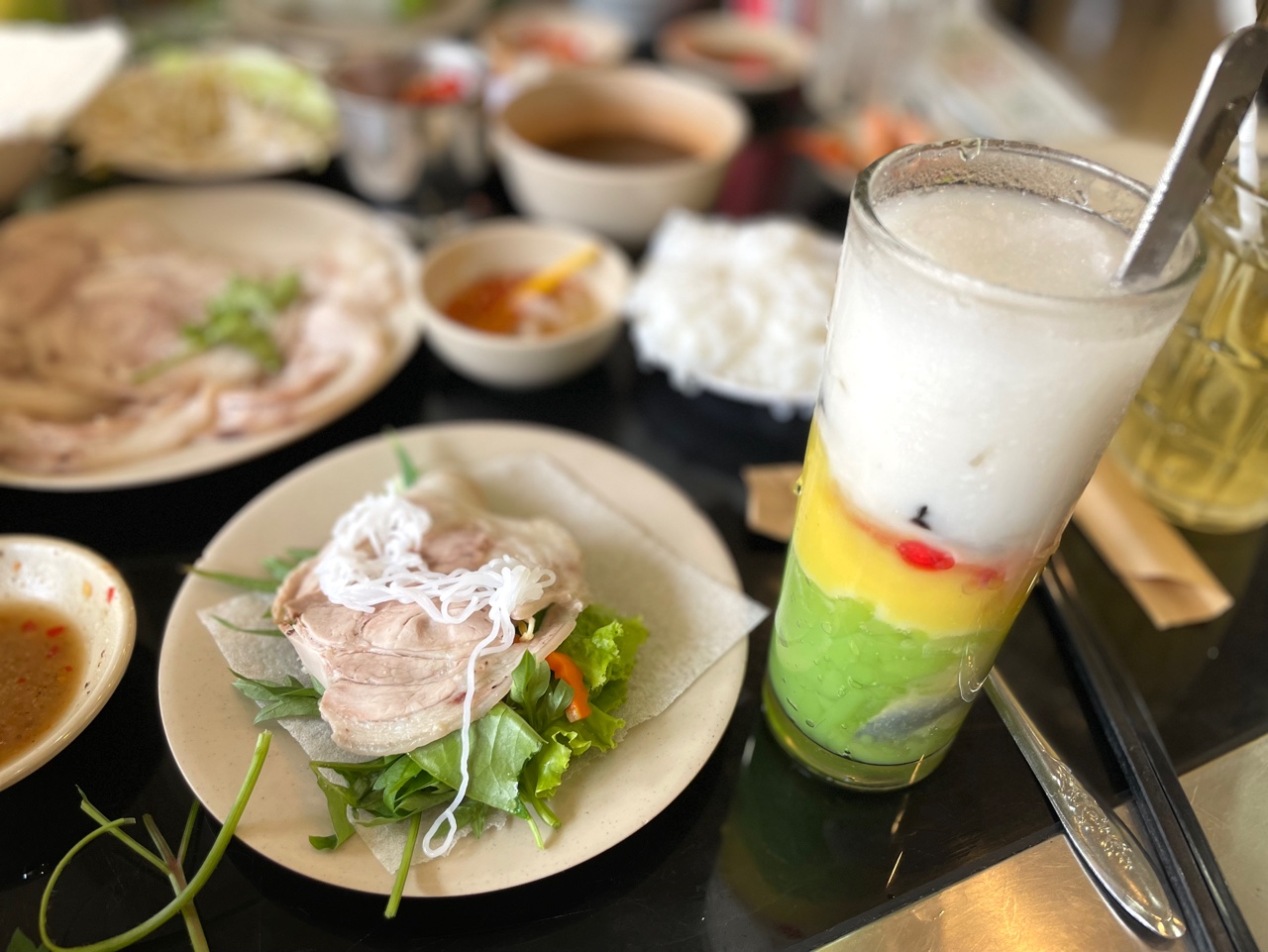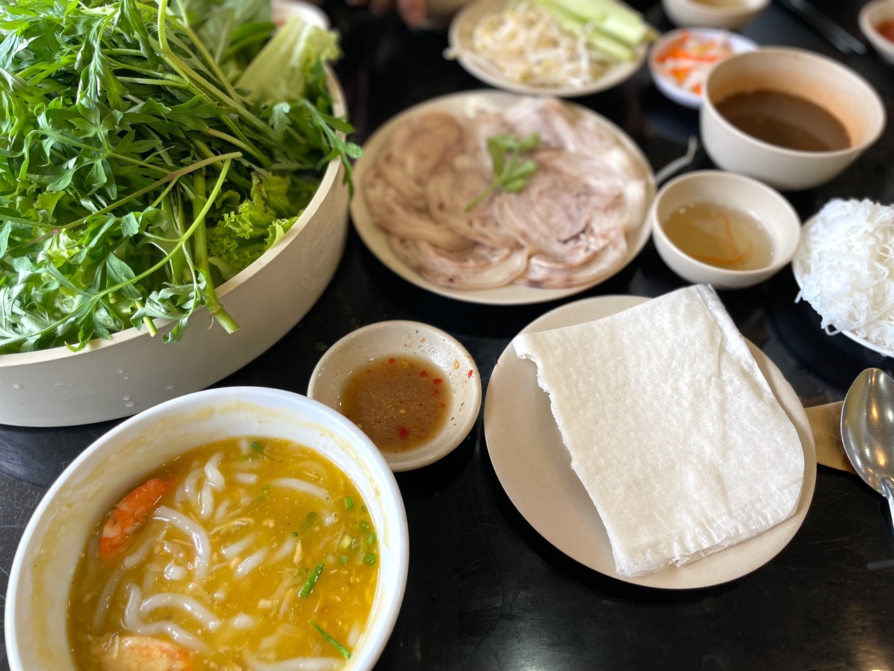 이런 식으로 얇게 저민 고기와 여러 채소, 얇은 쌀면(분) 등을 얹어서 돌돌 말아서 먹는다.