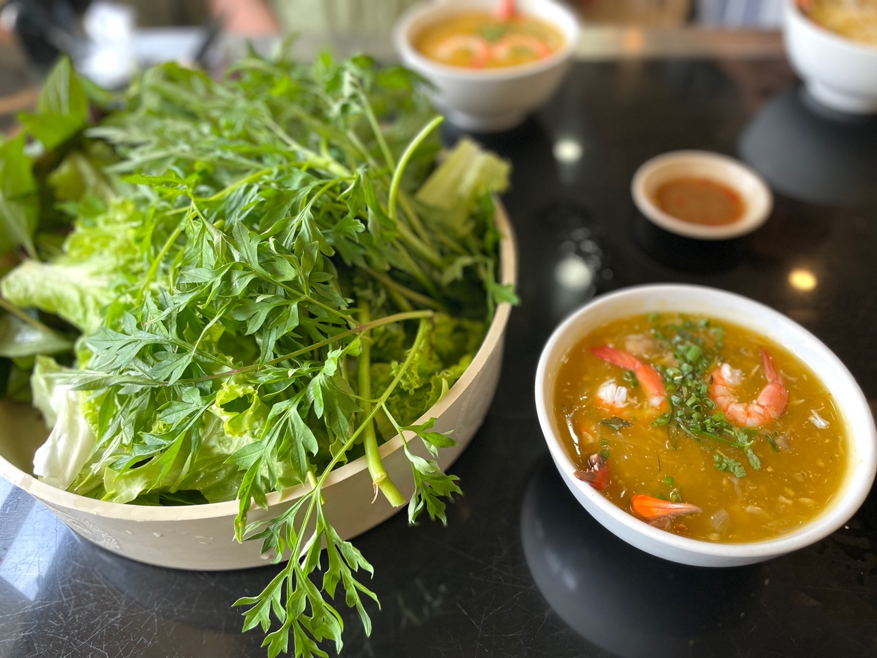 반깐 꾸어, 그리고 고기와 채소류를 시켰는데, 한눈에 딱 보기에도 꽤나 채소들이 싱싱하다.