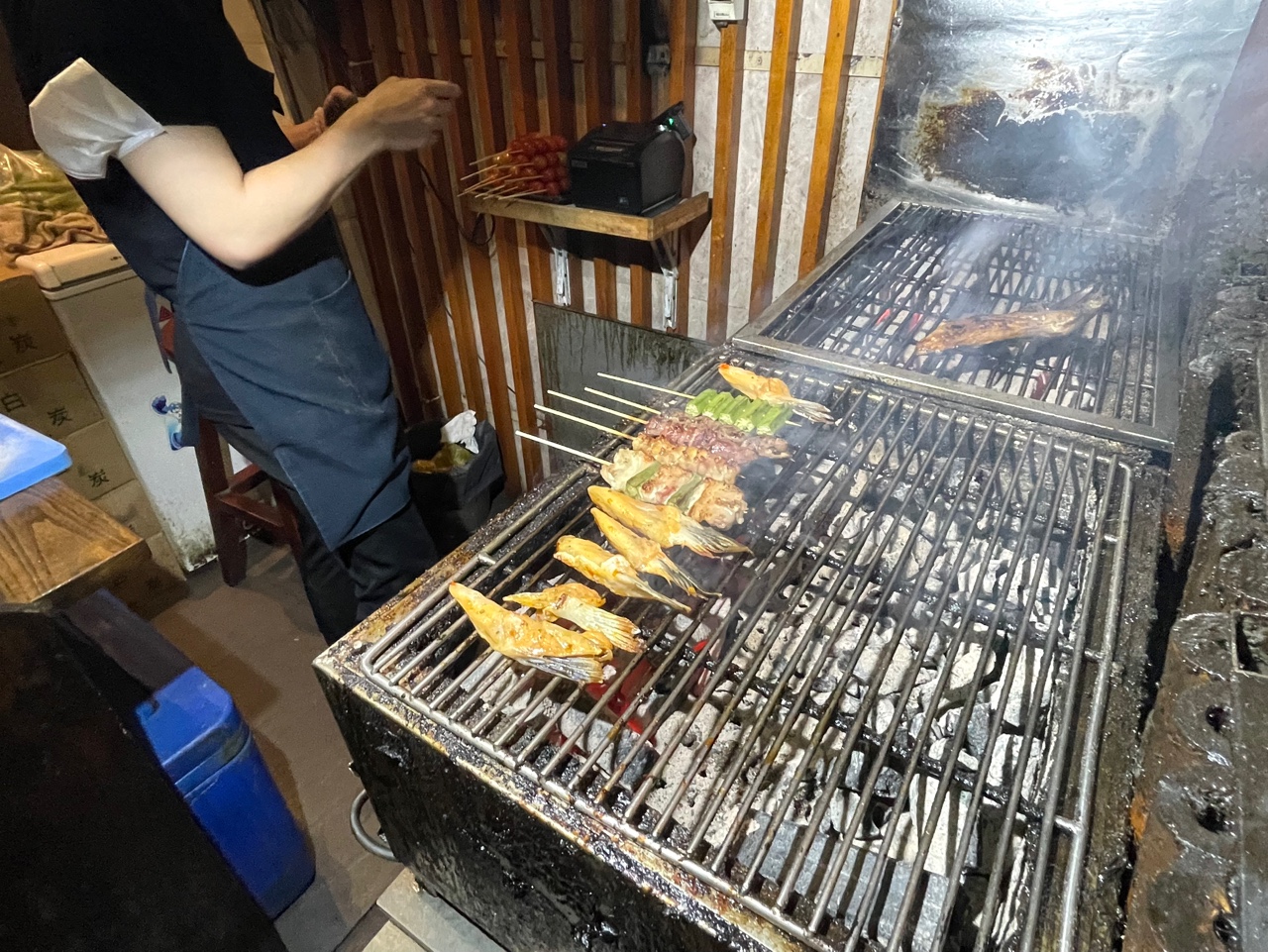 이자까야의 기본 메뉴인 꼬치구이. 각종 꼬치류가 숯불 위에서 노릇하게 익어가는 것이 보인다.