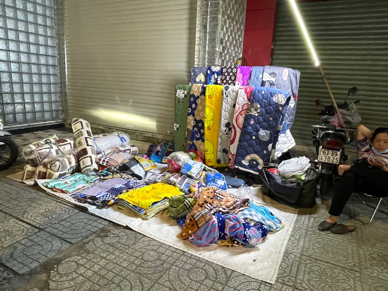 빅씨 건너편 길거리의, '이불'이나 '베개 커버'를 파는 아주머니.