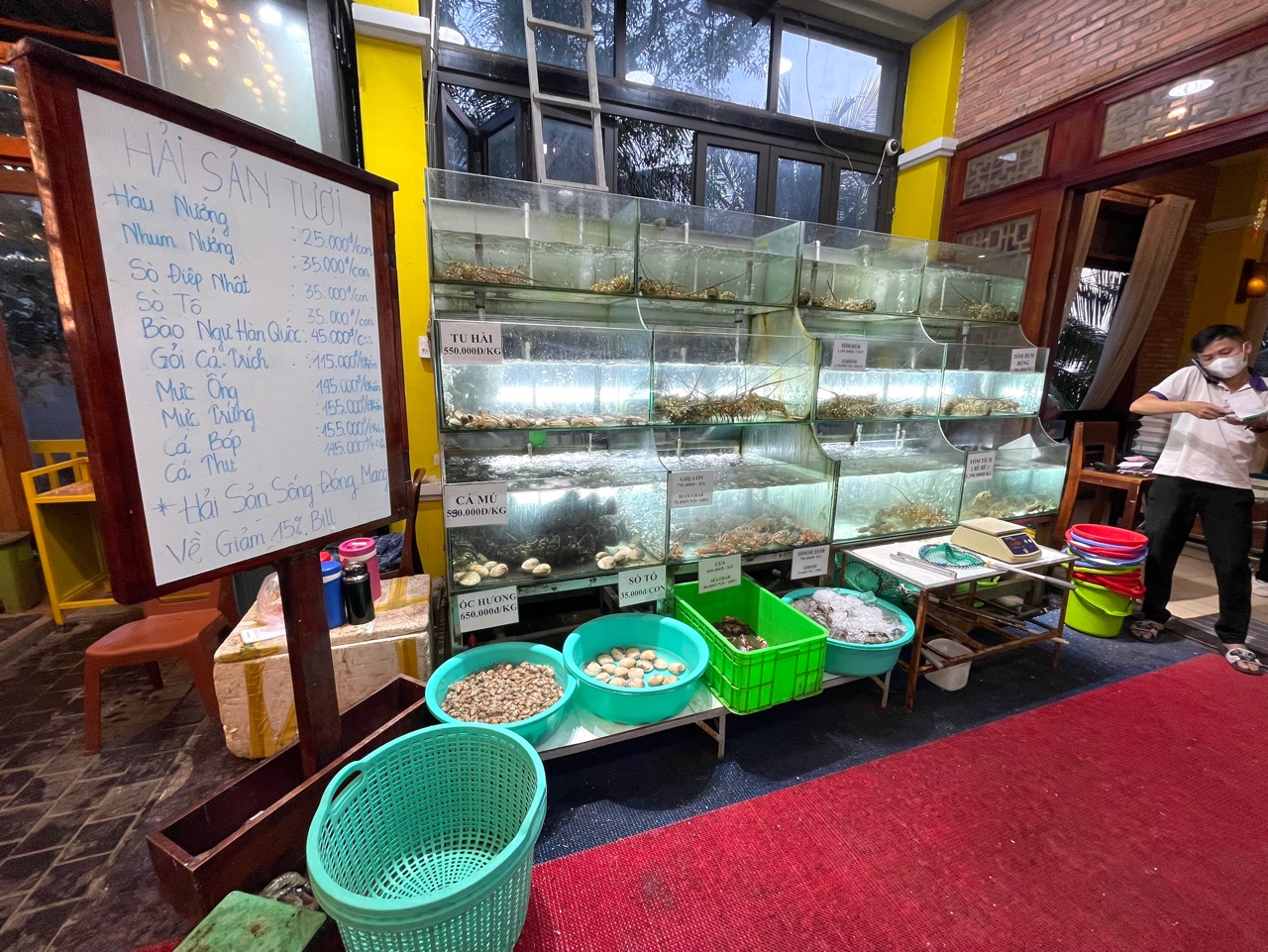 여러 종류의 해산물도 가득하다. 슬쩍 보기만 하여도 수족관 관리가 좋은 것을 볼 수 있다. 그만치 회전율이 좋다는 뜻일 터. 역시 해산물은 특히나 회전율이 좋은 곳으로 가야 신선한 음식을 맛볼 수 있다. ( 물론 수족관을 깨끗하게 보이게 하는 약품을 이용할 수도 있겠으나, 베트남은 그냥 수족관을 청소하는 1명을 고용하는 것이 더 저렴할 수 있다 )