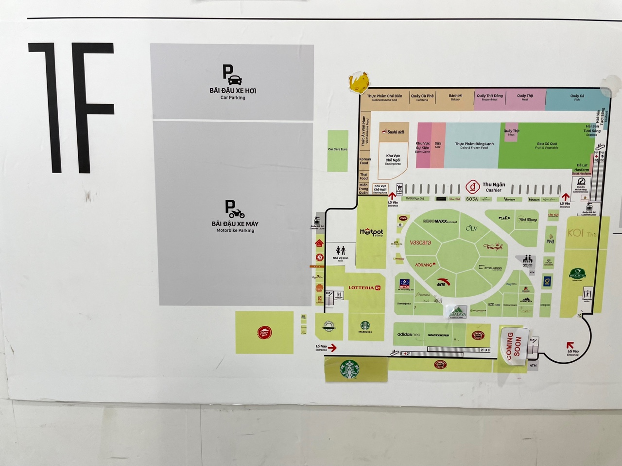1층은 아무래도 여러 브랜드들과 / 롯데리아 / 스타벅스 / 푹롱카페 / 마트