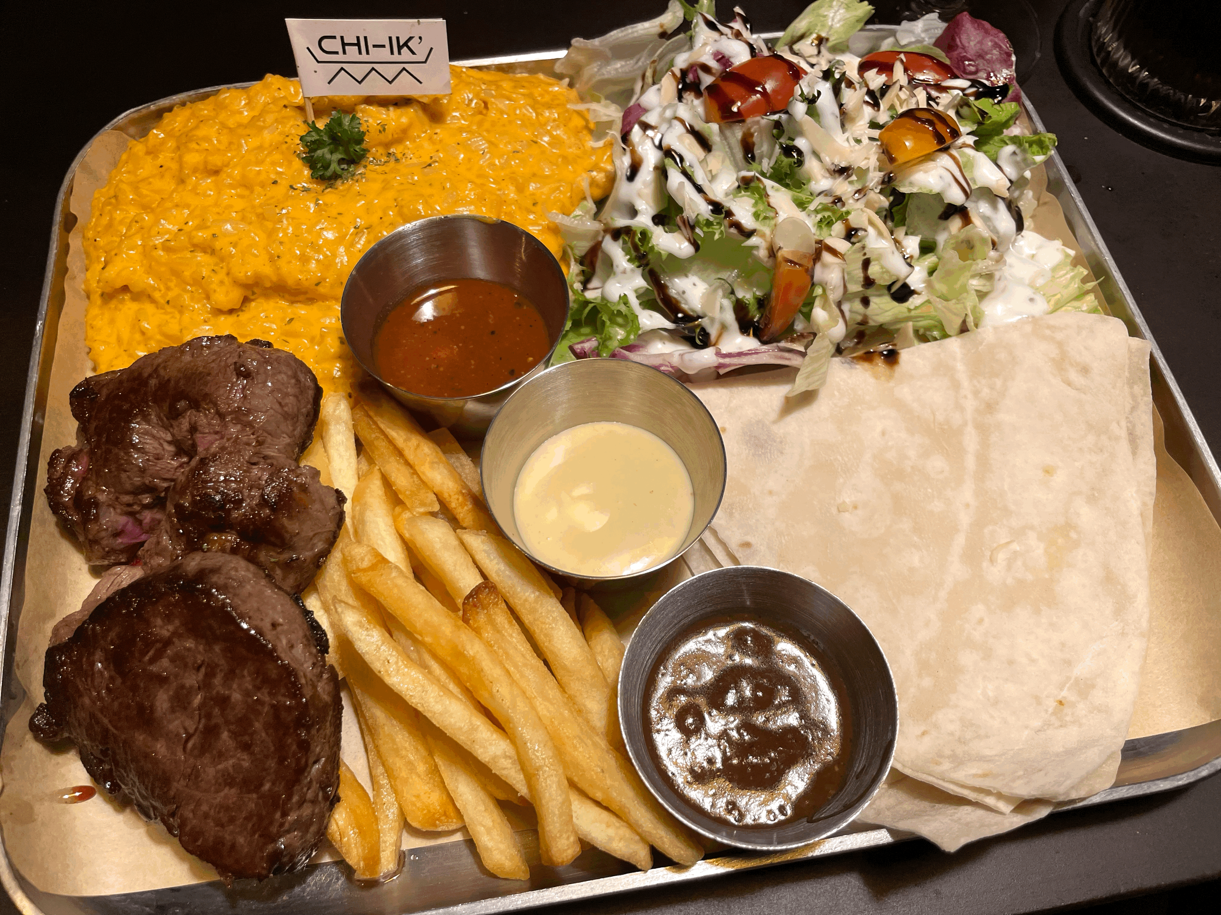그리고 나온 콤보 세트. 스테이크부터 감자튀김, 파스타에 이르기까지... 맛으로는 뭐 하나 빠지는 것이 없다.