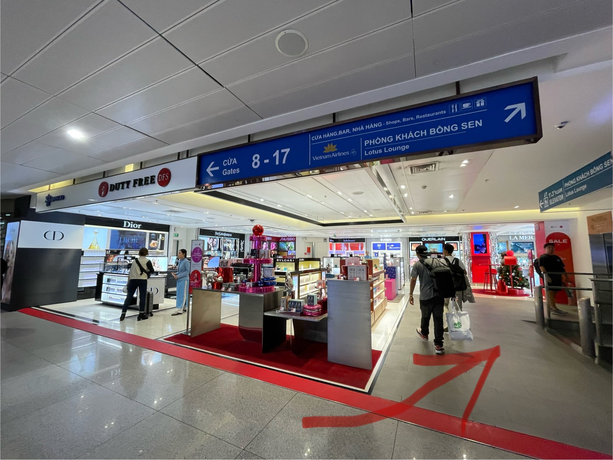 1) 공항 검색대에서 나와서 '8~17번 게이트'로 가는 방향과 '18~27번 게이트'로 가는 표지판의 중간점을 찾는다.