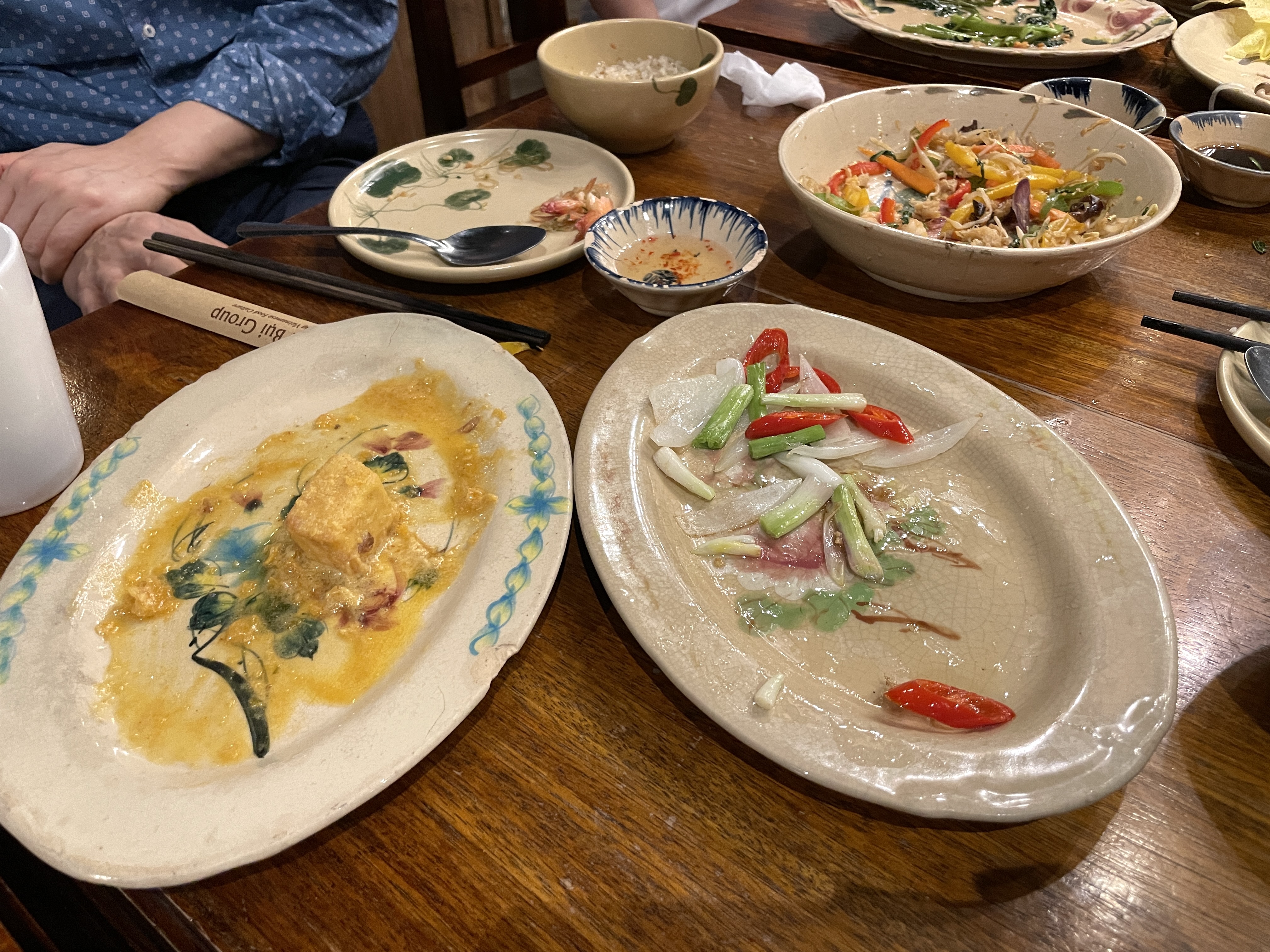 두부 튀김 요리와 삼겹살 종류, 반쎄오, 모닝글로리 볶음(라우멍), 오징어 볶음, 마늘 볶음밥 등 다양하게 주문을 하였다.
