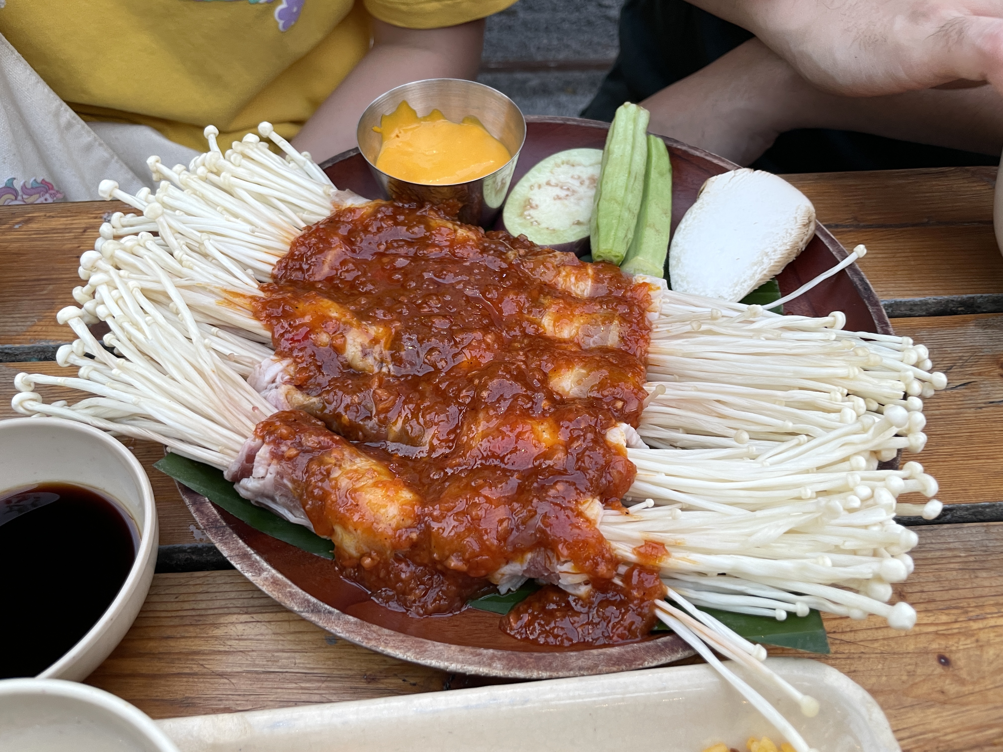 고기나 버섯은 아무 양념 없이 구웠을 때가 가장 맛있는데, 강력한 소스들이 뿌려져 있다. 곱창 같은 것도 그렇고, 모든 구울 것에는.. 어김없이 뿌려져 있는 달콤 시큼한 양념들. 한국인이라면 양념을 뿌리더라도 매콤 달달한 소스를 뿌렸을 것인데, 약간 이질감이 느껴지는 것은 어쩔 수 없다. 그냥 받아들여야 하는 부분.